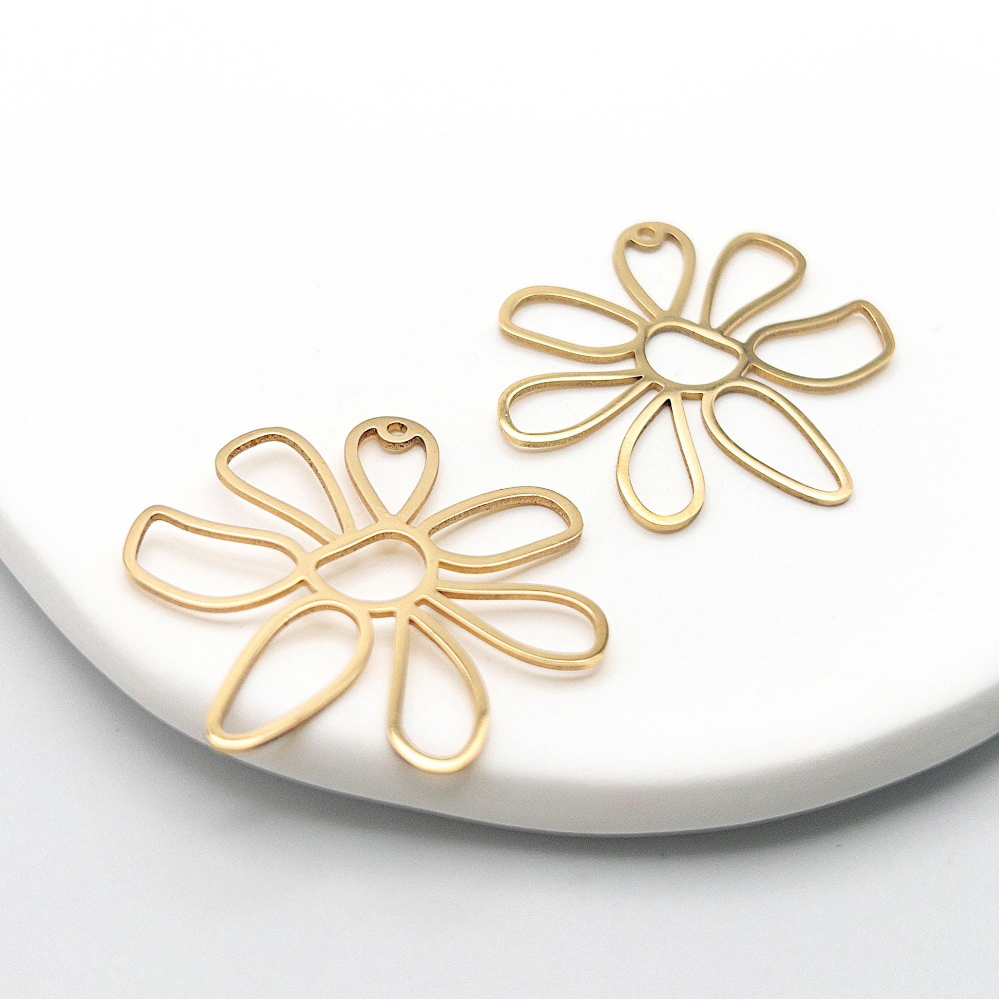 This modern and chic daisy flower pendant is crafted from durable 316L stainless steel and features a long-lasting PVD plating for added strength and resilience. Perfect for creating unique jewelry pieces, it can be used as a UV resin jewelry frame or paired with polymer clay to make one-of-a-kind designs. The simple yet elegant flower design adds a touch of natural beauty, making it an ideal choice for custom necklaces, earrings, or other jewelry creations. With its sturdy stainless steel construction and stylish finish, this pendant offers both versatility and lasting quality for your handmade jewelry projects.